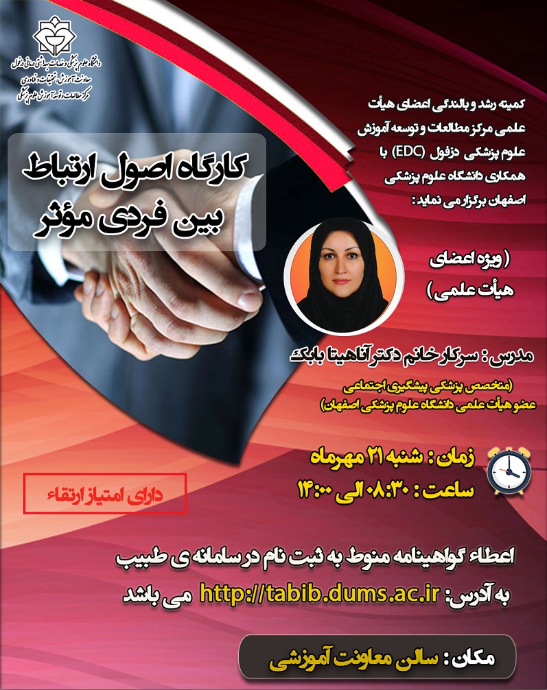 دکتر عزت اله قاسمی، رئیس مرکز مطالعات و توسعه آموزش علوم پزشکی (EDC) این دانشگاه از برگزاری کارگاه آموزشی یک روزه "اصول ارتباط بین فردی موثر" جهت اعضای محترم هیأت علمی خبرداد.