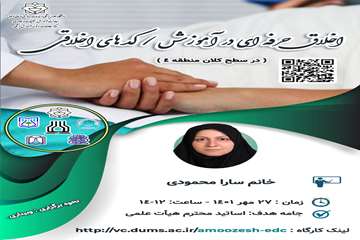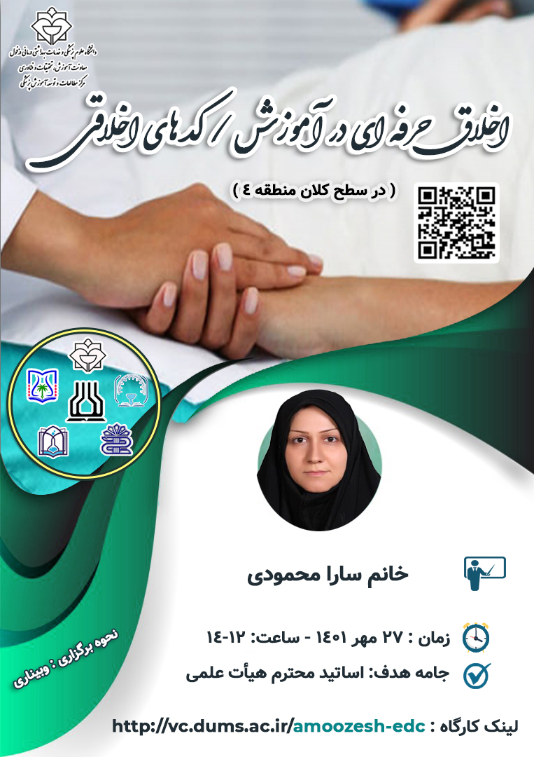 وبینار اخلاق با موضوع اخلاق حرفه ای در آموزش /کدهای اخلاقی در تاریخ 27 مهرماه 1401 - ساعت 12 الی 14 با ارائه سرکار خانم سارا محمودی (از اعضای هیأت علمی دانشگاه علوم پزشکی دزفول) برگزار شد .